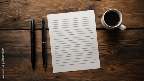 Black pens and blank lined paper with a coffee mug on a wooden table background for creative writing or office workspace concepts