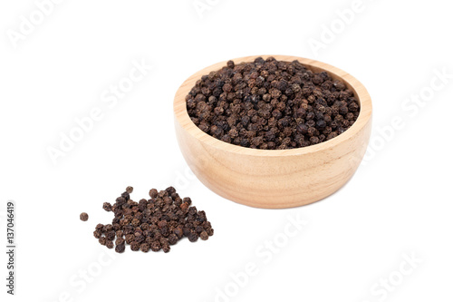 black peppercorns in wooden bowl