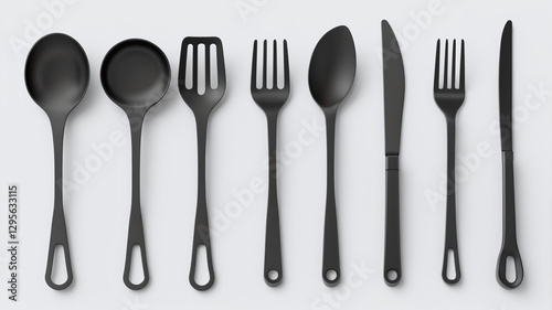 Black plastic kitchen utensils arranged neatly on light background, showcasing variety of tools for cooking and serving. Ideal for modern kitchen designs