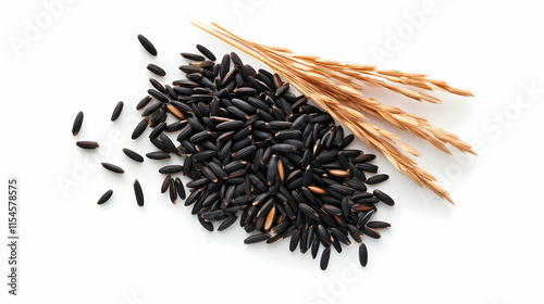 Black rice grains with rice stalks on white background, food photography for packaging.