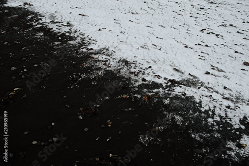 iceland, tour tourism, travel, winter, landscape, beach, nature, sightseeing, volcanic, scenery, topography, tourist attraction, black, sand, basalt, remote, wilderness, season, climate, weather, coast, headland, southeast, seacoast, shoreline, background, contrast, diagonal, igneous, line, snow, white, cold, texture, glacé, full frame, colours, icy, pattern, half, environment, peninsula