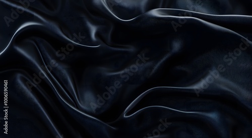 Black satin fabric, an elegant and luxurious background. Dark silk texture. Black cloth background. Black silk satin fabric with waves of soft folds