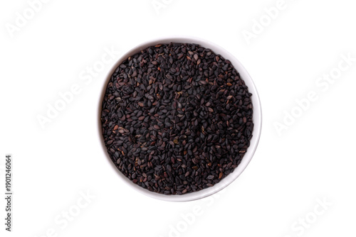 Black sesame seeds in a bowl, an ingredient for oil and healthy eating. Black sesame