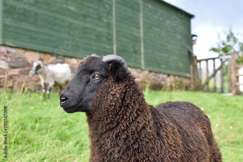 black sheep with brown eyes in a farm