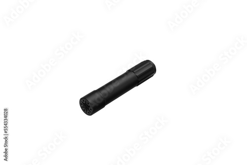 Black silencer for weapons. Suppressor that is at the end of an assault rifle. Isolate on a white back.