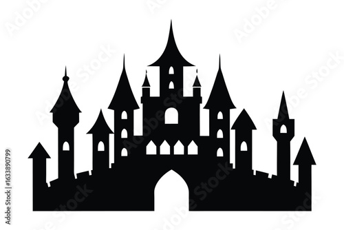 castle, fairy tale, silhouette, black, and, white, architecture, fantasy, mediaeval, royals, fortress, kingdom, tower, gateway, arch, gothic, storybook, magical, illustration, design, icon, symbol, outline, building, structure, ancient, historic, imagination, dream, princess