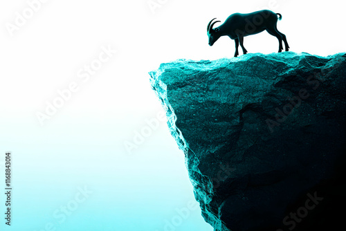 Black silhouette of a goat standing on the edge of a rocky cliff against a light background in an artistic concept photo
