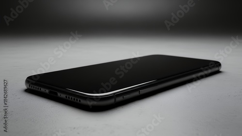 smartphone, mobile, device, technology, communication, phone, electronic, contraption, digital, modern, black, dark, sleek, minimal, studio, background, grey, texture, surface, object, advertising, design, contemporary, sophisticated, elegant, clean, portable, new, premium, smooth, polished, closeup, perspective, low angle, abstract, light, shadow, gradient, simplicity, screen, speaker, port, buttons, wireless, convenience, future, innovation