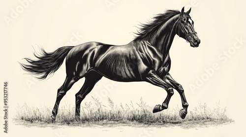 horse, fast horse, black, galloping, meadow, freedom, power, grace, elegant, majestic, equine, animal, nature, wildlife, wild, running, mane, tail, windswept, field, monochrome, black-and-white, vignetting, drawing, illustration, art, vintage, rustic, country, western, equestrian, thoroughbred, mustang, wild horse, animal portrait, speed, motion, dynamic, energy, strength