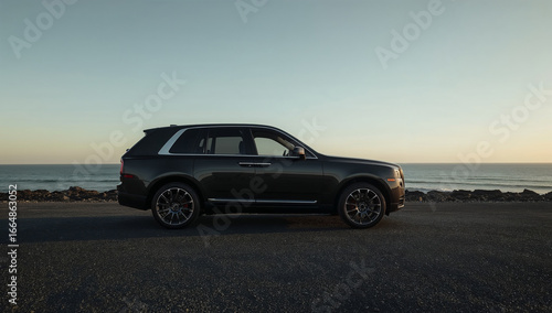 suv, black, ocean, vehicle, auto, modern, luxury, travel, road, landscape, transport, freedom, coastline, adventure, horizon, stylish, scenic, journey