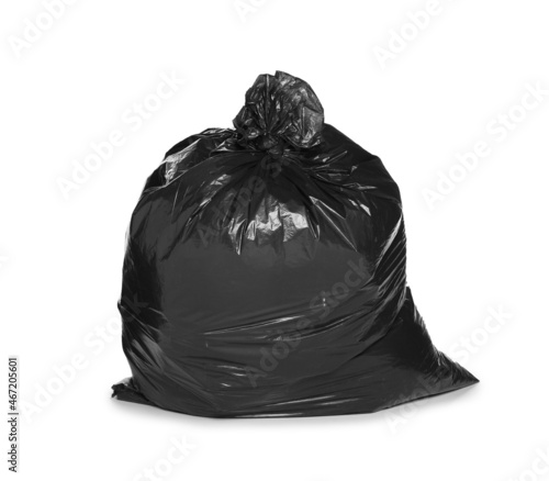 Black trash bag filled with garbage isolated on white