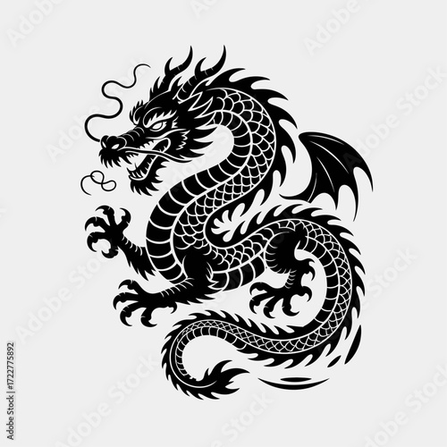 Black Vector Illustration of Traditional Chinese Dragon | Stylized Curled Chinese Dragon Icon | Classic Mythical Dragon Drawing for Design Assets