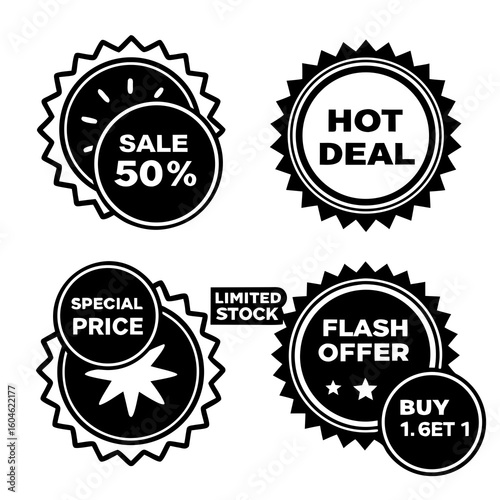 sale, discount, offer, special price, badge, tags, label, sticker, promotion, marketing, commerce, retail, shopping, price tag, percentage, special offer, deal, bargain, announcement, graphic, vector, black-and-white, isolated, symbol, icon, advertising, business, commercial