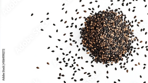 Black, white speckled pattern on white background. Close-up view of dry sesame seeds. Organic, healthy, natural, herbal ingredient. Top-down perspective, macro shot of grain kernel. Black, white