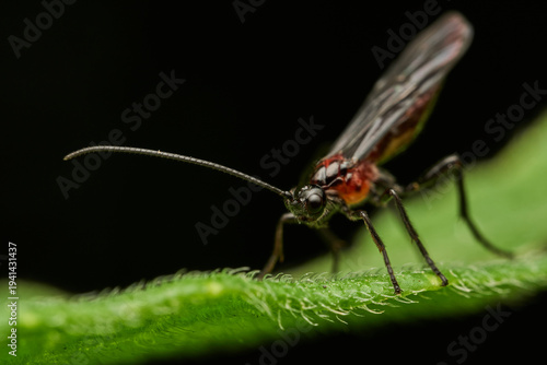 insect, macro, closeup, wildlife, nature, entomology, arthropod, bug, photo, professional, leaf, green, perch, resting, detail, texture, pattern, slender, thin, body, wing, black, red, contrast, sharpened, bokeh, outdoors, natural, environment, habitat, fauna, biology, ecosystem, organic, small, tiny, sharp, clarity, camouflage, predator, species, field, plant, foliage, surface, daylight, exploration, observation
