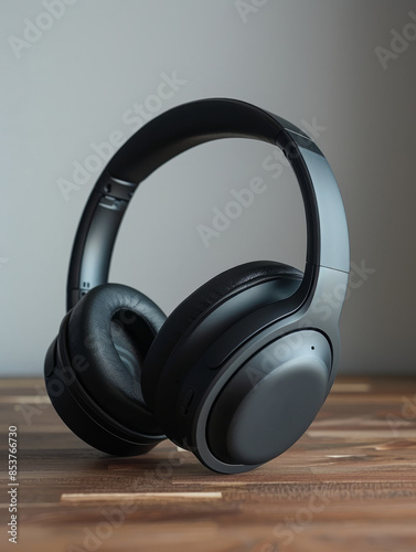 Black wireless over-ear headphones on a wooden surface