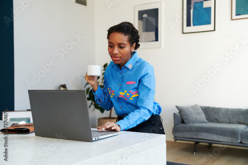 african, afro, alone, american, attractive, beautiful, black, business, businesswoman, casual attire, close, closeup, hot drink, conference, copy space, cup, daylight, drink, drinking, female, free, freelancer, girl, goggles, hair, holding, home, indoor, indoor, isolation, laptop, light, modern, 1, online, quarantine, self employed, short, to sit, sitting, smile, smiling, table, thoughtful, time, up, woman, work, working