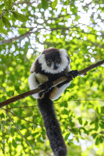 Black-and-white ruffed lemur (Varecia variegata subcincta) in natural rainforest habitat, Nosy Mangabe forest reserve. Madagascar wildlife and wilderness