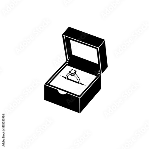 Black-and-white vector illustration of open jewelry box with engagement ring symbolizing romance and special occasions
