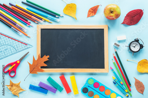 Blackboard and school supplies stationery, colour pencils, paints, scissors, ruler, alarm clock, apple, autumn leaves on blue background. Back to school concept. Top view, flat lay. Mock up