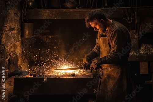 blacksmith, metalworking, forge, anvil, spark, workshop, craftsmanship, evening, tool, iron, heat, artistry, manual labor, fire, shaping, traditional, skill, process, glow, production, craft, labor, rejuvenation, strength, creation, warmth, focused, historical, agriculture, industry, heritage, technology, trade, fireworks, handiwork, mastery, technique, precision, dedication