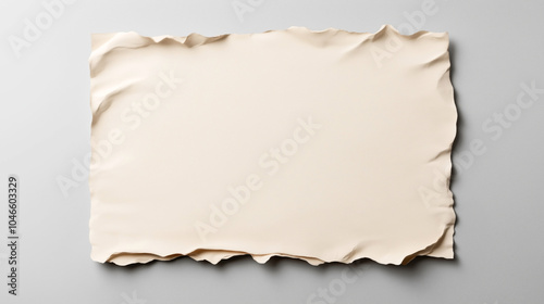 Blank aged parchment paper with rough, ragged edges isolated on a light gray background, suggesting an ancient or vintage style suitable for historical or artistic purposes.