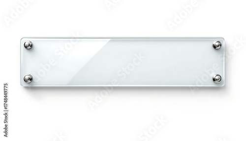 Blank bar-shaped clear glass nameplate secured with metal silver rivets isolated on white background