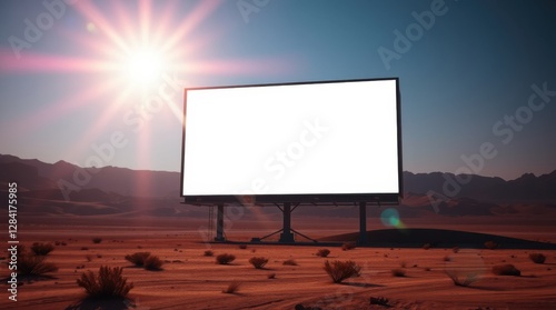 Blank billboard stands in a desolate desert landscape, under a bright sun, ready for advertising.