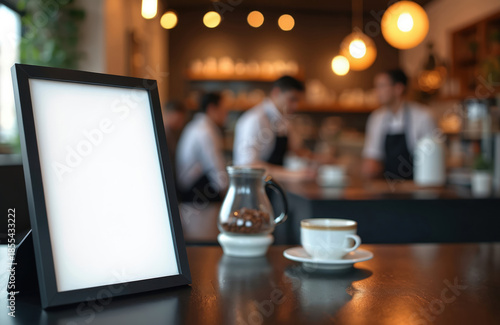 Blank black frame stands on cafe table near coffee cup. Blurred baristas work in background creating inviting atmosphere. Useful for menus or promos.