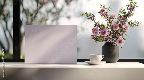 Blank canvas pink flower black vase white cup saucer sunlight window indoor peaceful