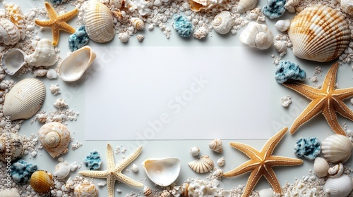 Blank card framed by seashells, starfish, and sand on a light blue background.