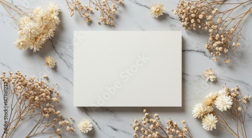 card, surround, minimal, clean, marble, table, neutral, beige, still life, nature, invitation, stationery, announcement, greeting, photo, display, presentation, floral, flower, dried flowers, surface, message