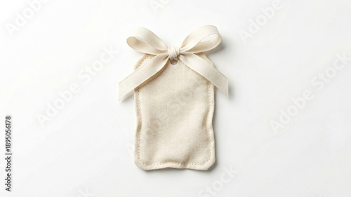 Blank Fabric Gift Tag with Bow Isolated on White Background, Handmade Textile Label and Craft Mockup