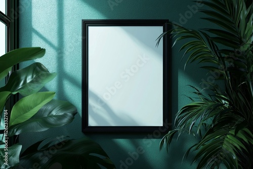 frame, blank, poster, template, design, tropical, plant, leaf, greenery, teal, wall, sunlight, shadow, indoor, home decor, modern, minimalist, stylish, artwork, presentation, display, showcase, advertising, marketing, branding, photo, image, picture, space, copy space, background, texture, green, nature, vibrant, foliage, elegant, clean, simple, aesthetic, calm, serene, peaceful, relaxing