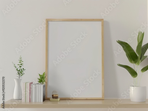 Blank frame mockup with wooden frame on a shelf with potted plants and books