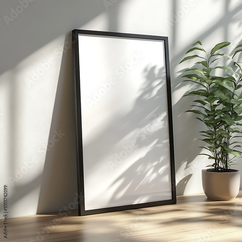 frame, blank, white, wall, plant, pot, shadow, light, sun, wood, floor, minimalist, modern, interior, design, home, decor, style, room, space, empty, template, background, clean, simple, aesthetic, serene, calm, peaceful, natural, greenery, leaf, beige, brown, artwork, display, image, picture, concept, photo