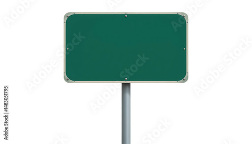 Blank Green Road Sign on Pole Ready for Custom Text, Isolated on White Background.