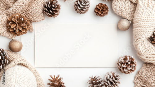 Blank greeting card or invitation with place for text surrounded by wrapped gifts and Christmas decorations on a white wooden background. Flat lay composition for design and print