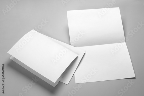 Blank half-folded booklet, postcard, flyer or brochure mockup template on gray background