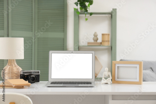 Blank laptop with frame, lamp and photo camera on desk in living room