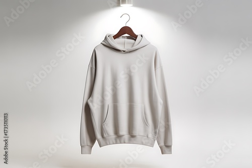 Blank light gray hoodie on a hanger with soft pink lining in studio lighting