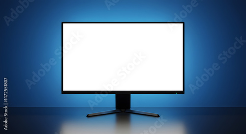 monitor, screen, display, blank, white, computer, technology, device, digital, electronic, desktop, workspace, office, studio, blue, light, ambient, glow, modern, sleek, minimalist, background, nobody, isolated, front view, rendering, three-dimensional, illustration, design, advertisement, presentation, marketing, template, frame, empty, clean, equipment, gaming, hardware, electronic, contraption, blank screen