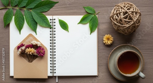 dried flowers, green leaf, teacup, topview, calm, peaceful, herbal tea, blank, notebook, with, dried, flower, tea, notepad, envelope, green, leaf, cup, and, wicker, ball, the, image, mood, honed, for, website, social, media, related, mindfulness