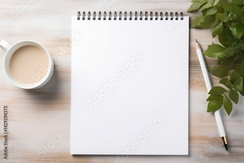 Blank notepad, cup of coffee, pencil, and green leaves on a wooden table. Ready for ideas.