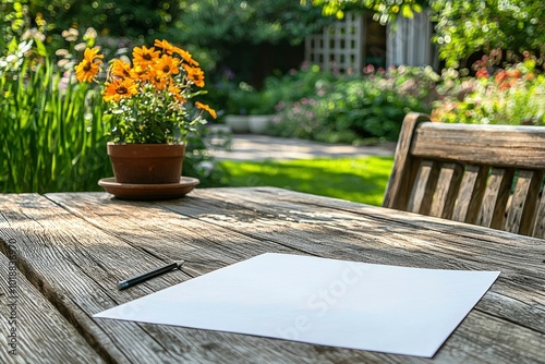 Blank Paper on a Wooden Table with a Pencil in a Garden Setting