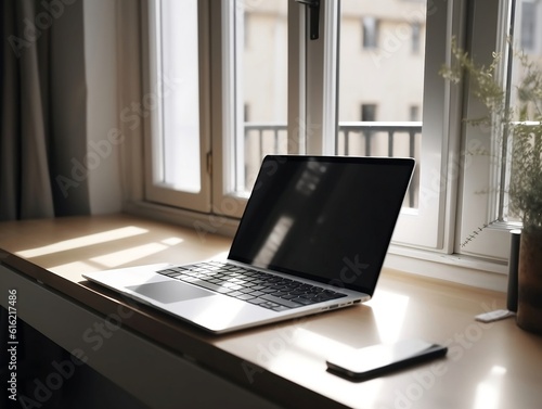 Blank screen laptop on wooden table in bright room, realistic and neutral scene with productivity ideas, generative AI