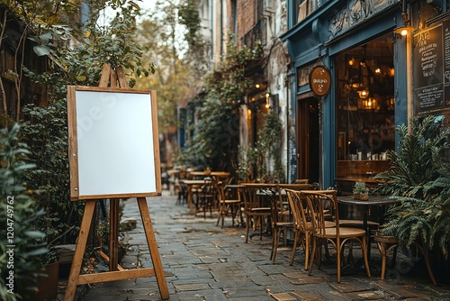 Blank signboard outside a quaint cafe, inviting customers to a charming outdoor seating area.