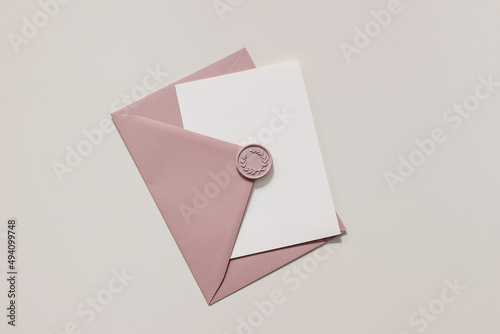 Blank wedding greeting card, invitation mockup scene in sunlight. Closeup of pink envelope with decorative wax seal on table. Birthday stationery template. Flat lay, top view. Feminine composition.