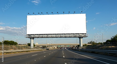 Blank White Billboard on Tall Metal Pole Beside Urban Highway with Cars and City Skyline under Blue Sky