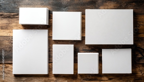 Blank white boxes arranged on a wooden surface